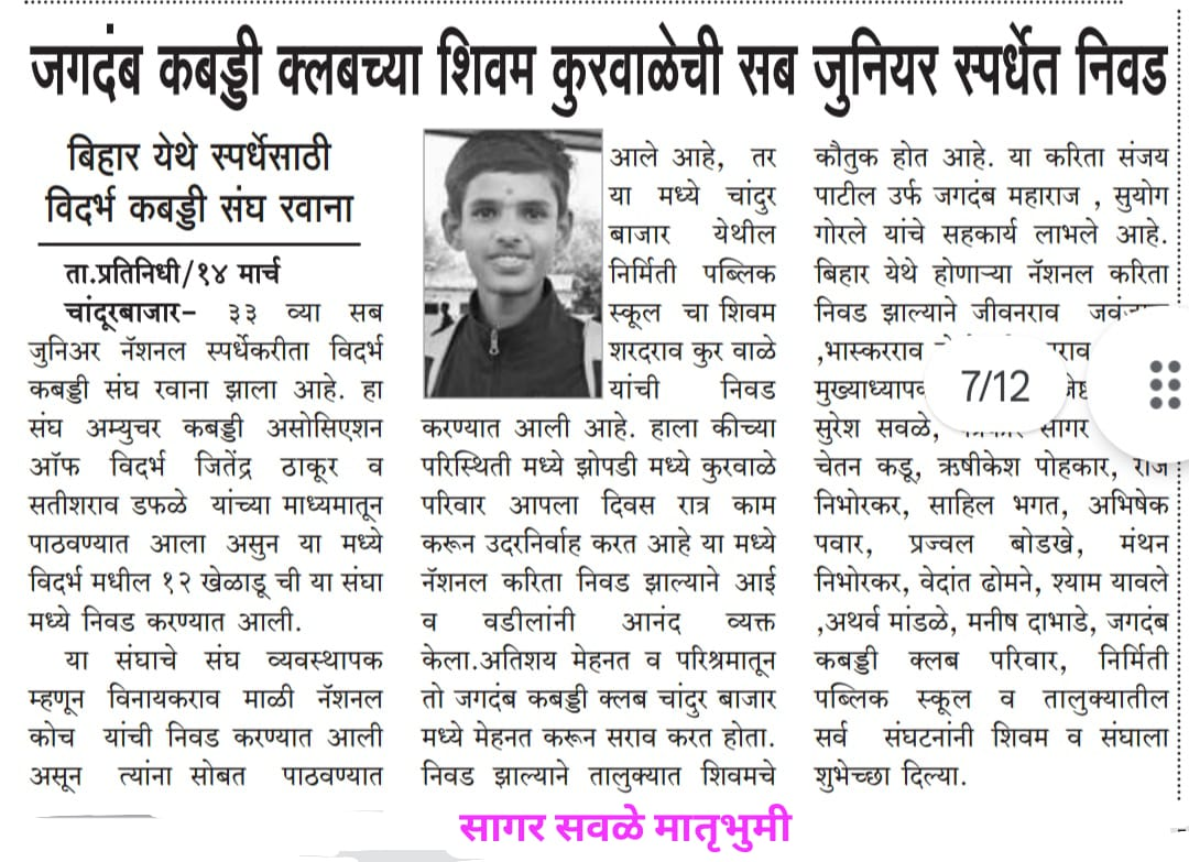 युवा प्रो कबड्डी लीग तामिळनाडू मध्ये माधान येथील खेळाडू व चांदुर बाजार येथील जगदंब कबड्डी क्लब मंडळ चा खेळाडू अभिषेक ओंकार पवार यांची युवा प्रो कबड्डी लीग तामिळनाडू मध्ये निवड होऊन यांनी उत्कृष्ट खेळाचे कौशल्य आपल्या संघामध्ये दाखवून विदर्भ ताडोबा टायगर संघाचे प्रतिनिधित्व उत्कृष्ट रित्या केल्या बदल ,,,,,मा श्री जितेंद्र ठाकूर सर अध्यक्ष विदर्भ अम्युचर कबड्डी असोसिएशन ऑफ विदर्भ, सतीशराव डफळे सर सहसचिव अम्युचर कबड्डी असोसिएशन ऑफ विदर्भ, संजय पाटील उर्फ जगदंब महाराज अध्यक्ष जगदंब कबड्डी क्लब चांदुर बाजार , सुयोग गोरले क्रीडा मार्गदर्शक व युवा प्रो कबड्डी लीग मार्गदर्शक , व जगदंब कबड्डी क्लब चांदुर बाजार सर्व परिवार तर्फे हार्दिक अभिनंदन 🤼♂️🤼♂️🤼♂️🤼♂️🤼♂️💐💐💐💐